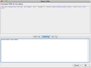 It's also possible to insert custom HTML for a specific element, so you can for example add an extra attribute. From the menu select Edit->HTML to display the Object HTML window.