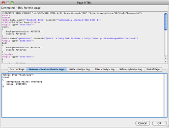 When you insert code in the Page HTML window, make sure you do not include the <html>, <head> or <body> tags! These tags are already generated by Quick 'n Easy Web Builder.