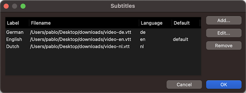 Note: For YouTube and Vimeo videos you can add the subtitles in the online configuration of the video.