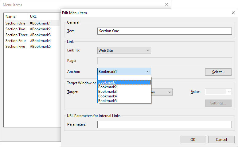 Create links in the menu to the bookmarks. For this demo the CSS Menu was used.