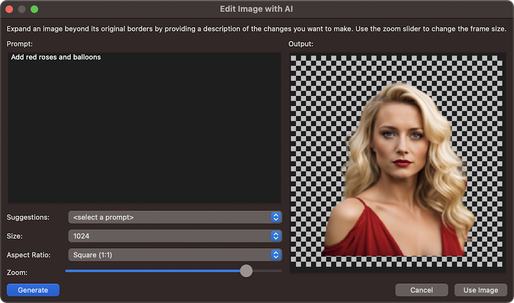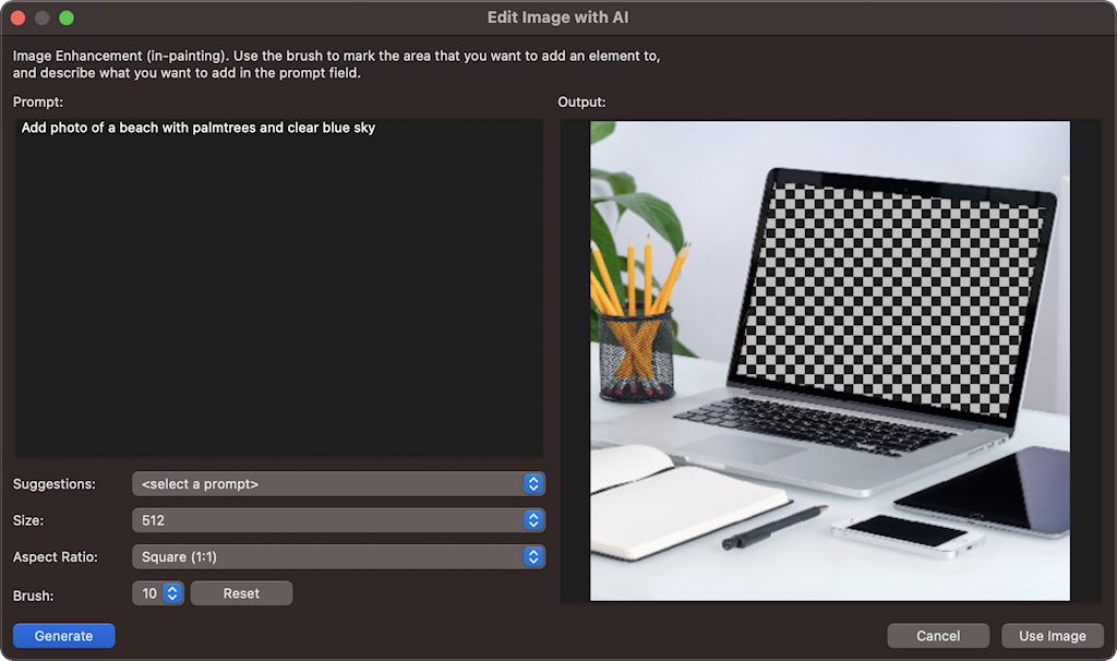 By default, the software uses the DALL-E 2 model to generate images, but DALL-E 3 is also supported which generally gives much better results. This can be configured in Preferences -> Artificial Intelligence