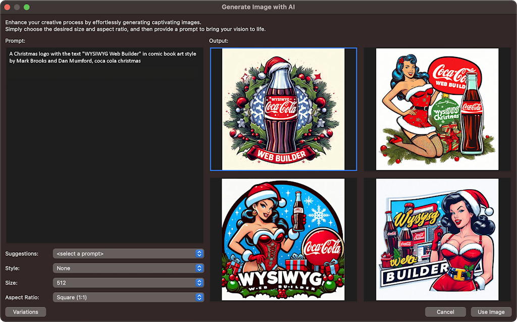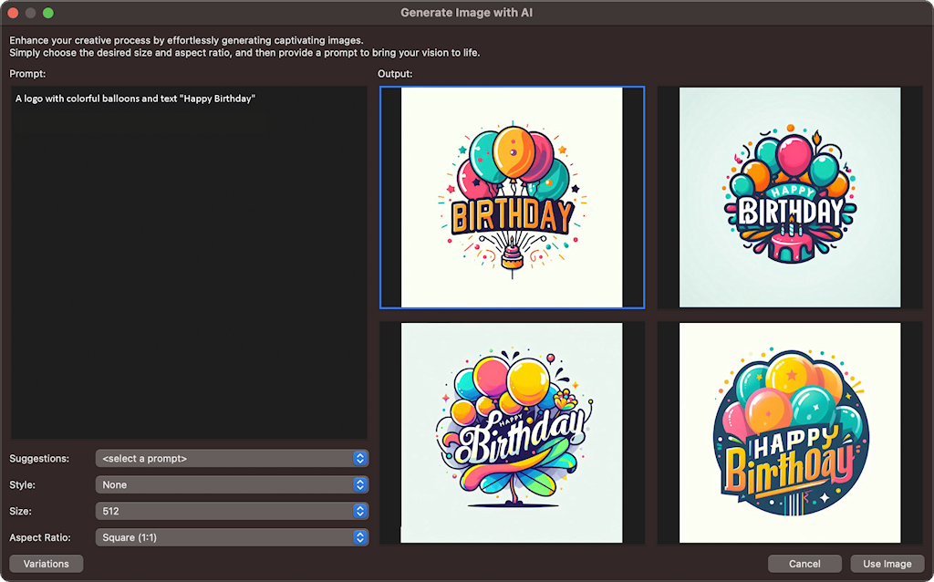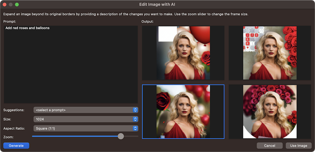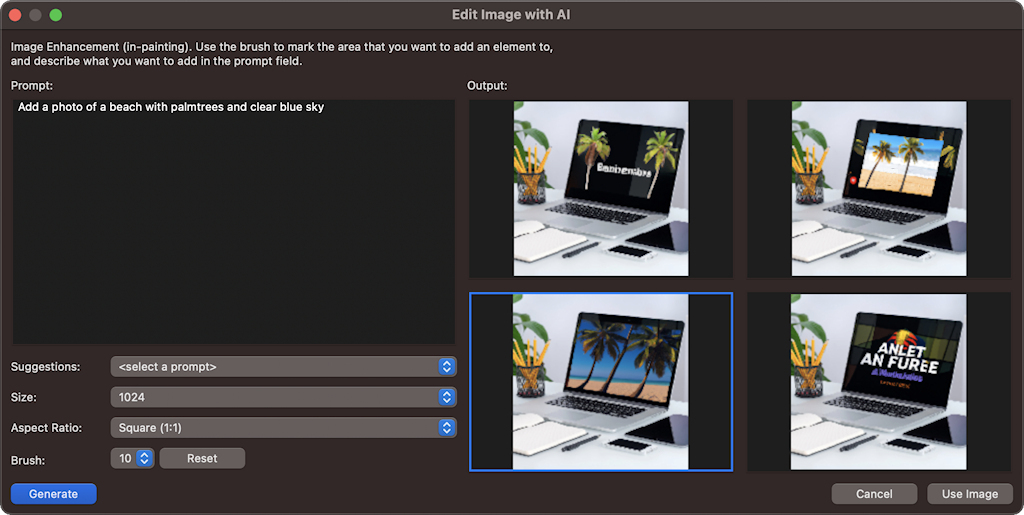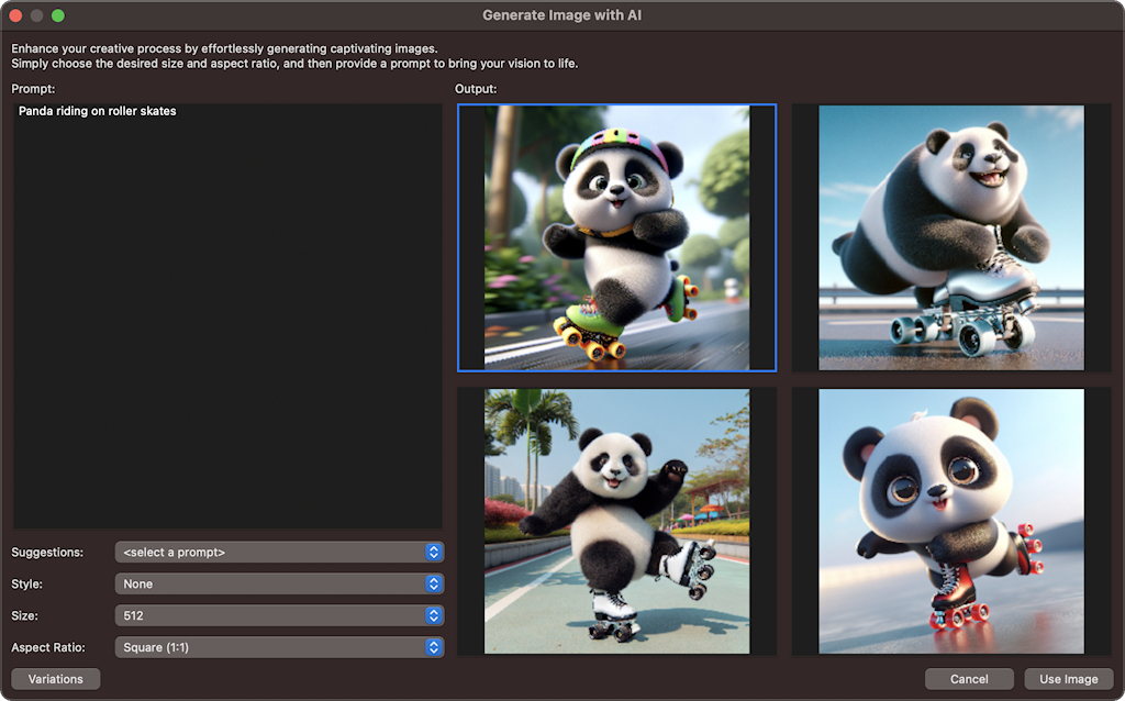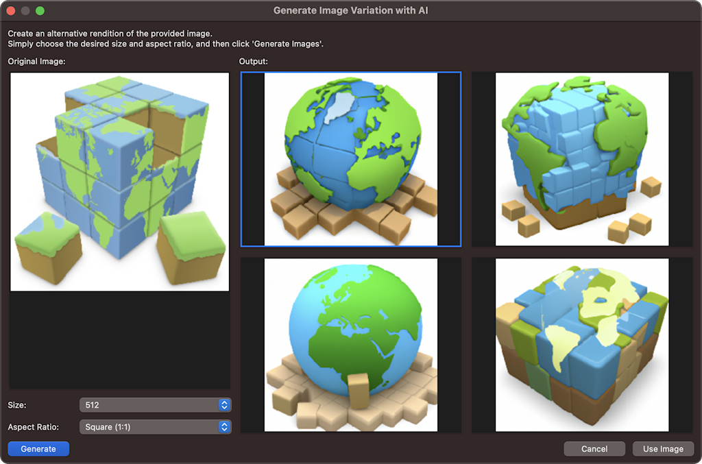 If you're satisfied with the one of the four generated images, you can select that image and the click 'Use Image' button to save it. However, you also create 3 other variants of the selected image by clicking the 'Generate variant of the selected image' button.