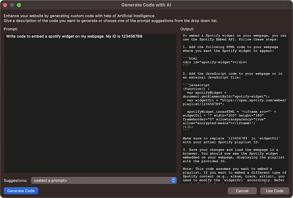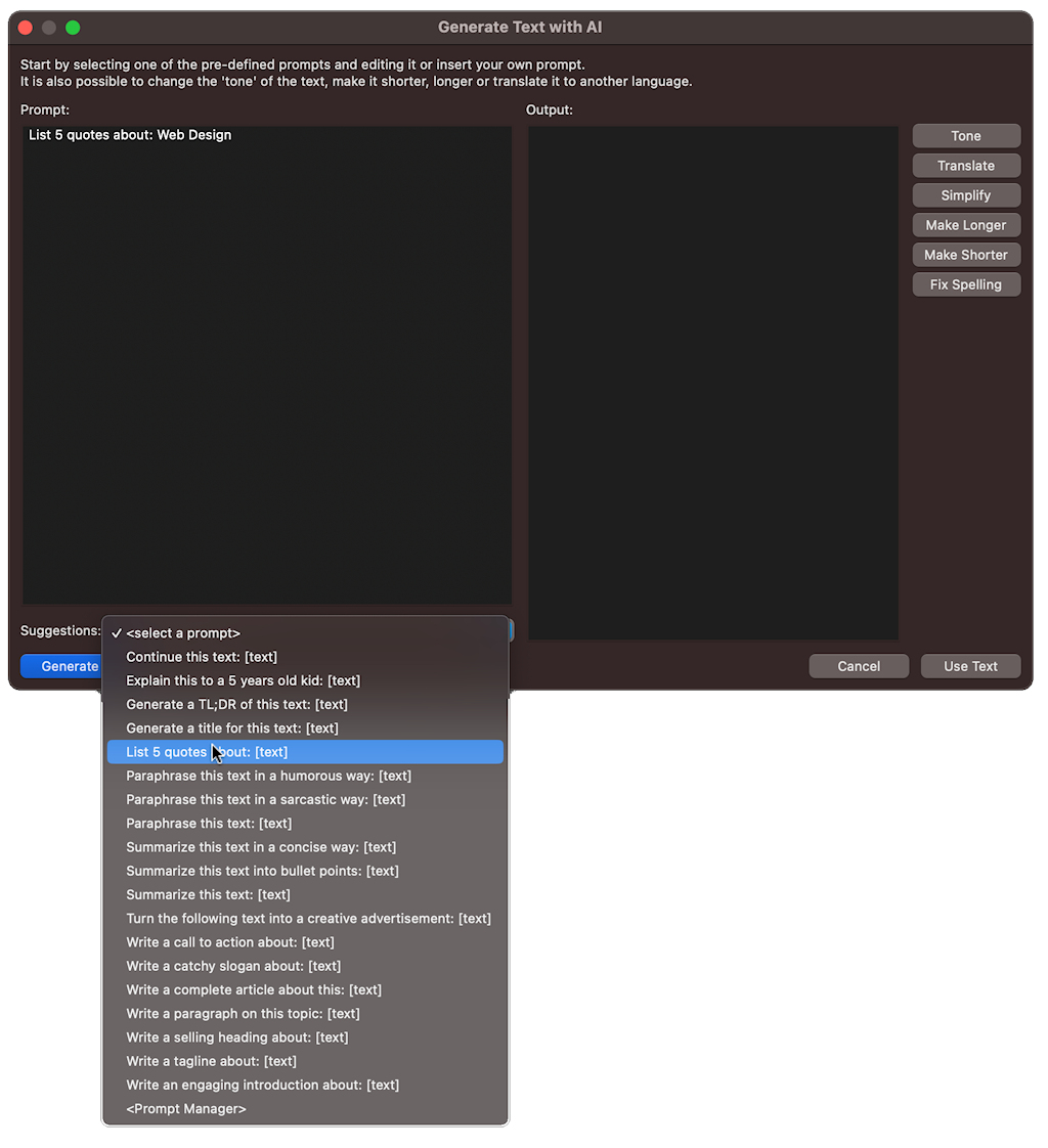 In the dialog, you can enter a custom prompt or choose one of the pre-defined prompts from the Suggestions drop down list.