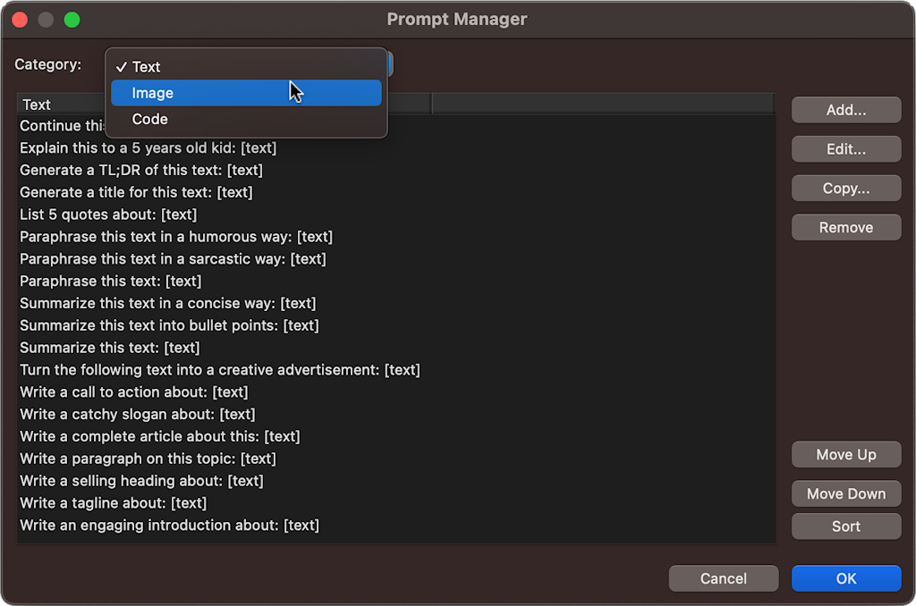 The Prompt Manager can be used to add, edit or remove prompts from the 'suggestions' lists. You can access the Prompt Manager via the link at the bottom of the suggestions list. Each category (text, images, code) has its own prompt list.