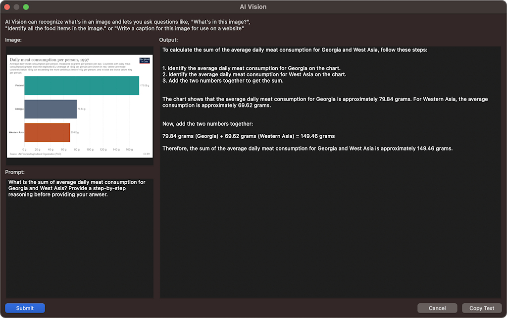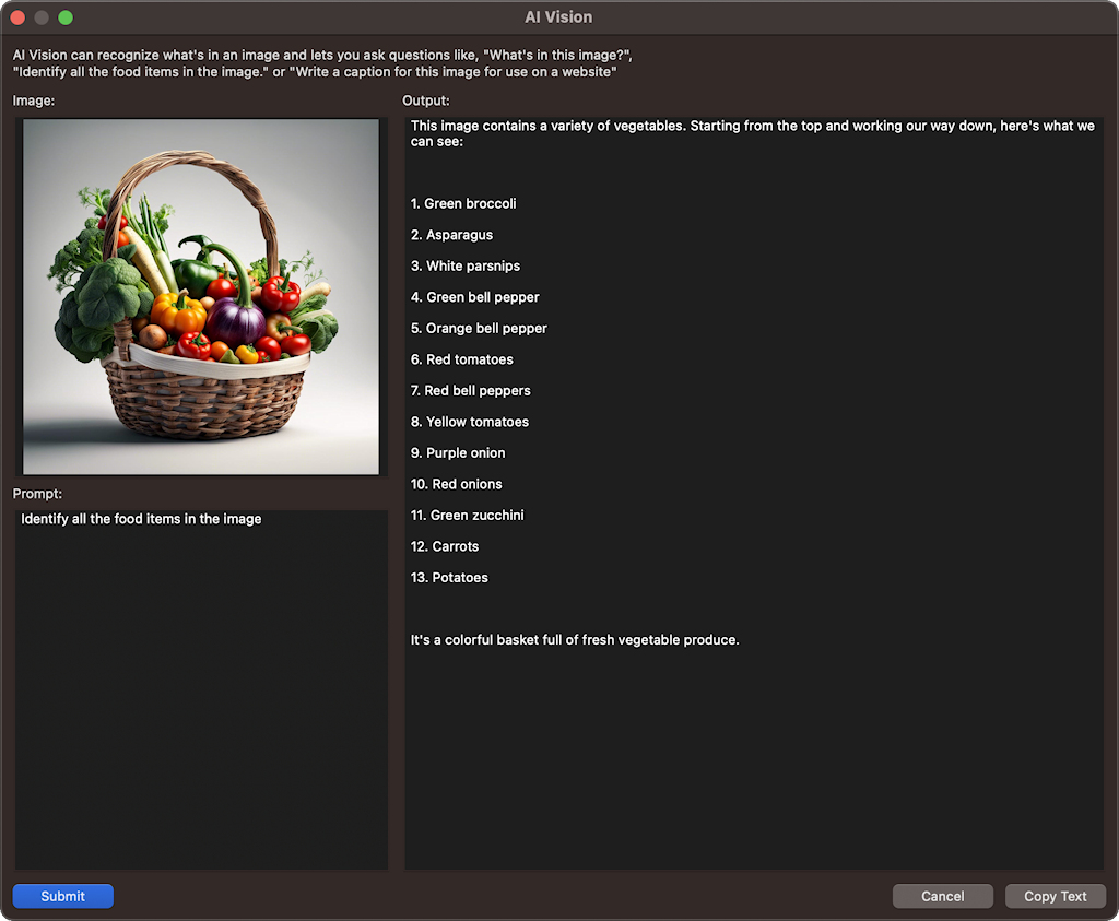 AI Vision can recognize what's in an image and lets you ask questions like, "What's in this image?", "Identify all the food items in the image." or "Write a caption for this image for use on a website". But you can also use it to extract text or translate the text from the image to a different language.