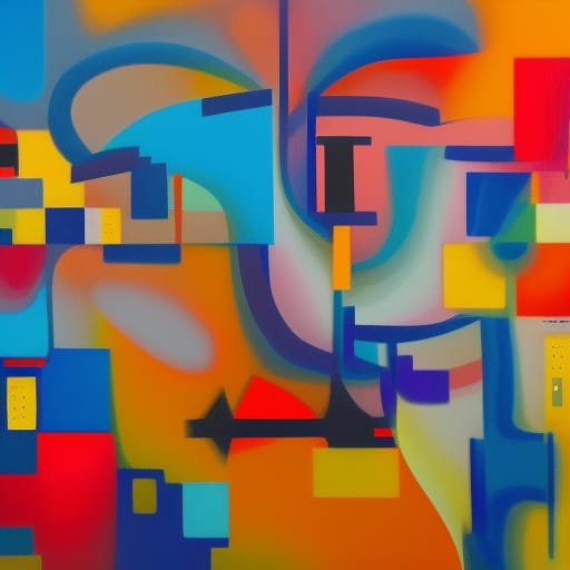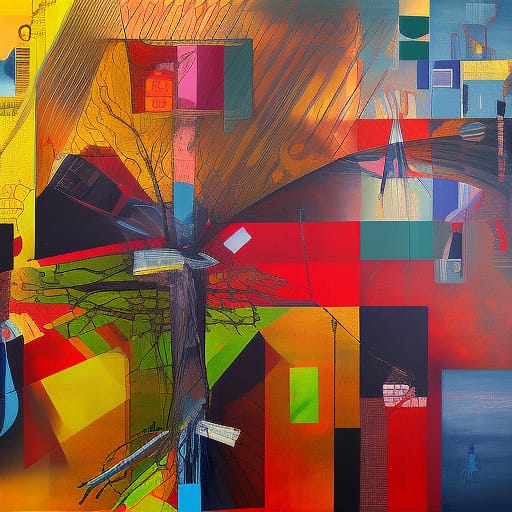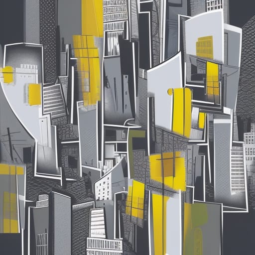2. A cityscape with buildings and streets fragmented into abstract forms, as if viewed from multiple angles at once, creating a dynamic, Cubist-inspired urban scene.