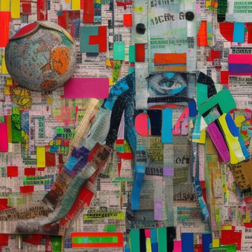 2.A mixed-media collage that incorporates recycled materials, vivid colors, and symbols of social and environmental activism, reflecting the artist's response to contemporary issues.