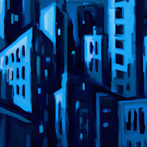 2. A bustling cityscape at night, with towering skyscrapers and frenetic energy, bathed in a surreal, electric blue light, evoking the isolation and anonymity of urban life in the style of expressionism.