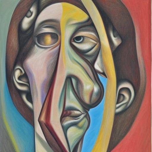 3. A distorted self-portrait, where the artist's face and features are exaggerated and fragmented, expressing a profound sense of inner conflict and introspection, expressionist art.