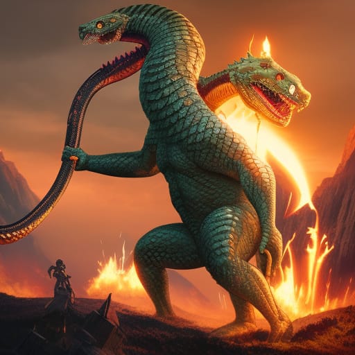 3. A legendary hero wielding a magical sword, facing off against a colossal, fire-breathing, and fearsome serpent in an epic battle amid a fantastical, ancient realm.
