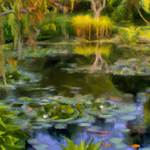 1. A serene garden by the pond at dawn, where lily pads float gracefully and the first light of day dances on the water, impressionist style.