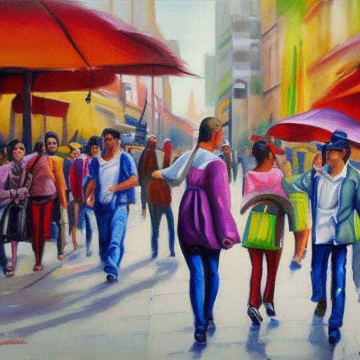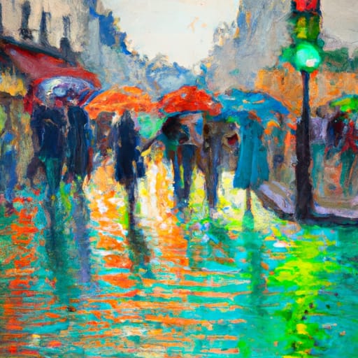 2. An impressionist painting of a bustling Parisian street corner on a rainy afternoon, with people hurriedly walking under colorful umbrellas, their reflections shimmering on wet cobblestones.