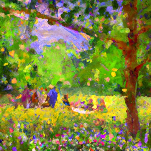 3. A relaxed picnic in a sunny meadow, friends eating lunch under tall trees, colorful wildflowers all around, and chirping birds. Create it in an Impressionist style!