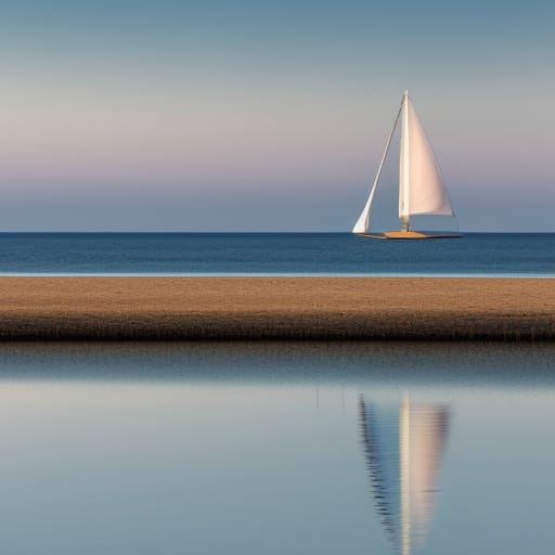 1. A serene seascape with a vast expanse of calm, empty horizon, where a single sailboat drifts under a clear, minimalist sky.