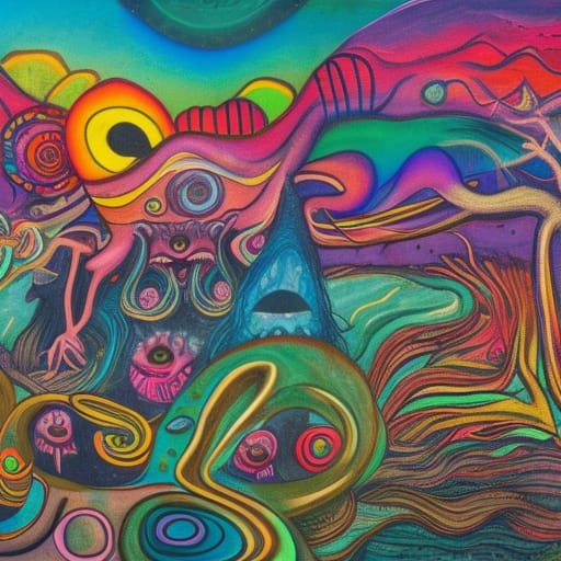 1. A vivid and chaotic dreamscape filled with fantastical creatures, surreal landscapes, and abstract symbols, as if from the mind of an outsider artist.