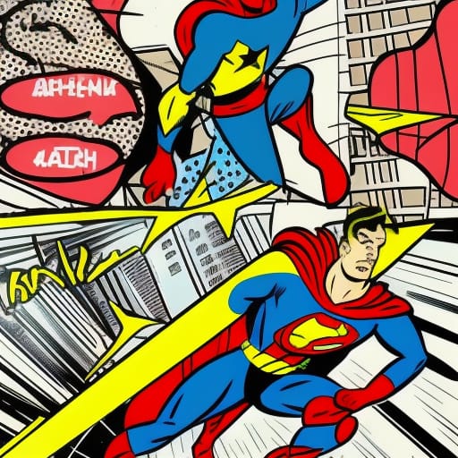 2. A dynamic collage of comic book panels featuring a superhero in action, with dots and bold lines reminiscent of Roy Lichtenstein's signature style.