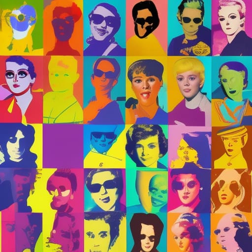 3. A pop culture montage of famous celebrities, musicians, and movie stars, composed with bright colors and repetitive patterns, capturing the essence of the 1960s Pop Art movement.