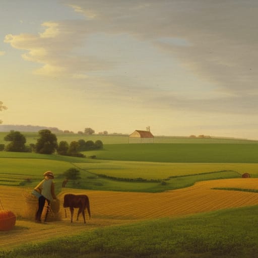 1. A serene rural landscape at dawn, with a farmhouse in the distance, fields of wheat stretching to the horizon, and a farmer tending to his crops in the style of realism.