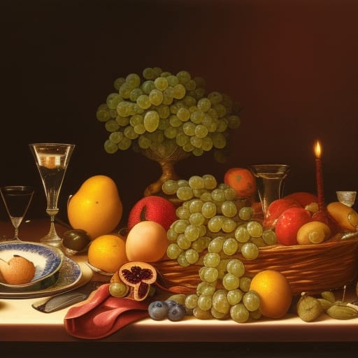3. A detailed still life of a table set for dinner, with a variety of fruits, vegetables, and dinnerware, bathed in the warm glow of candlelight in the style of realism.