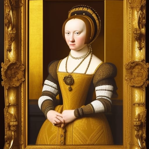 1. A classical portrait of a noblewoman in richly detailed Renaissance attire, framed by ornate architecture and bathed in the soft, golden light of a historical masterpiece.