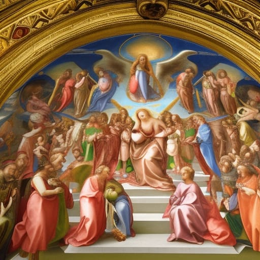 2. A grand Renaissance fresco adorning the walls of a majestic cathedral, featuring a heavenly assembly of angels, saints, and biblical figures in intricate detail.