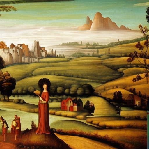 3. Craft a Renaissance-style landscape painting that showcases the harmonious blend of nature and human civilization, incorporating a picturesque countryside and a distant cityscape.