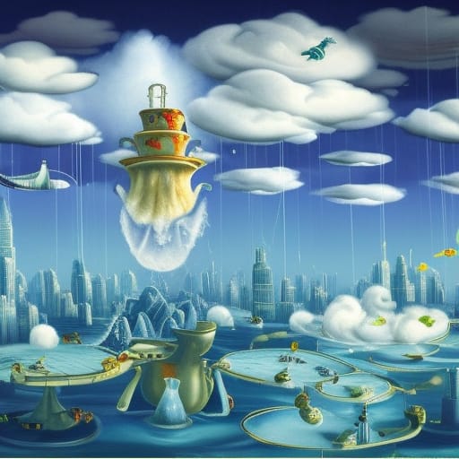 1. A floating cityscape in the clouds, with upside-down skyscrapers, flying fish, and a giant teapot pouring waterfalls into the sky in surrealist style.