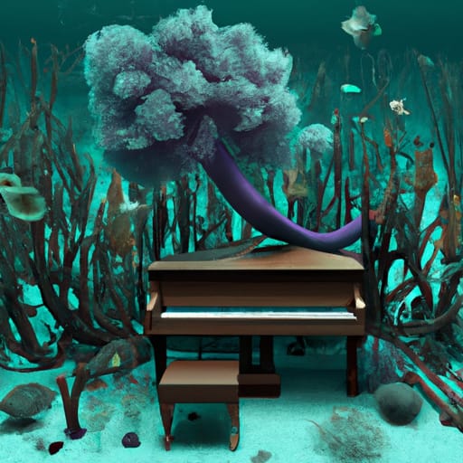 3. An underwater forest, with trees made of coral, fish swimming through branches, and a submerged piano playing music to a gathering of aquatic creatures, surrealist style.
