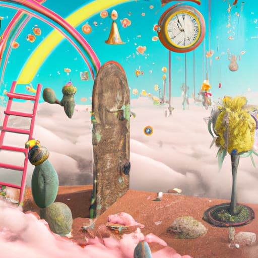 2. Design a surreal landscape where melting clocks hang from cacti like strange fruit, under a rainbow-colored sky with a staircase leading to a door in the clouds.