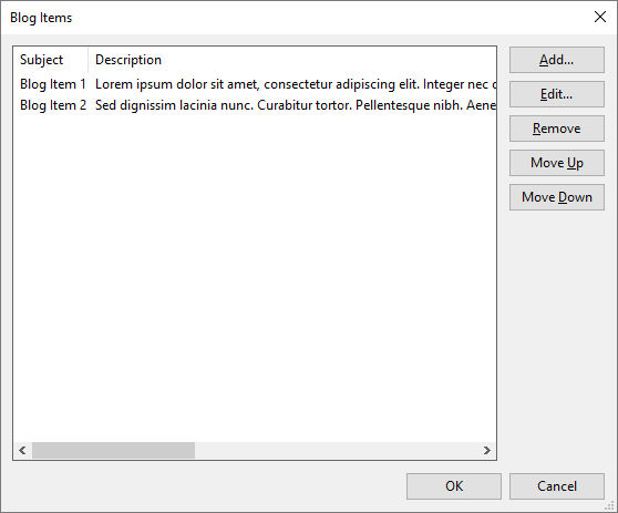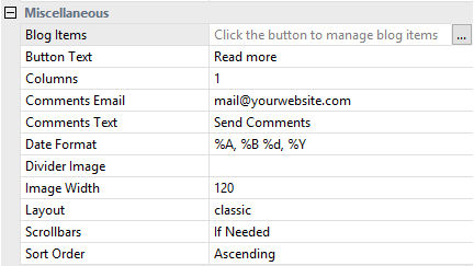 To add a new entry to the Blog, click the 'Blog Items' button in the properties. Give the entry a title and then type your blog's message in the text area.