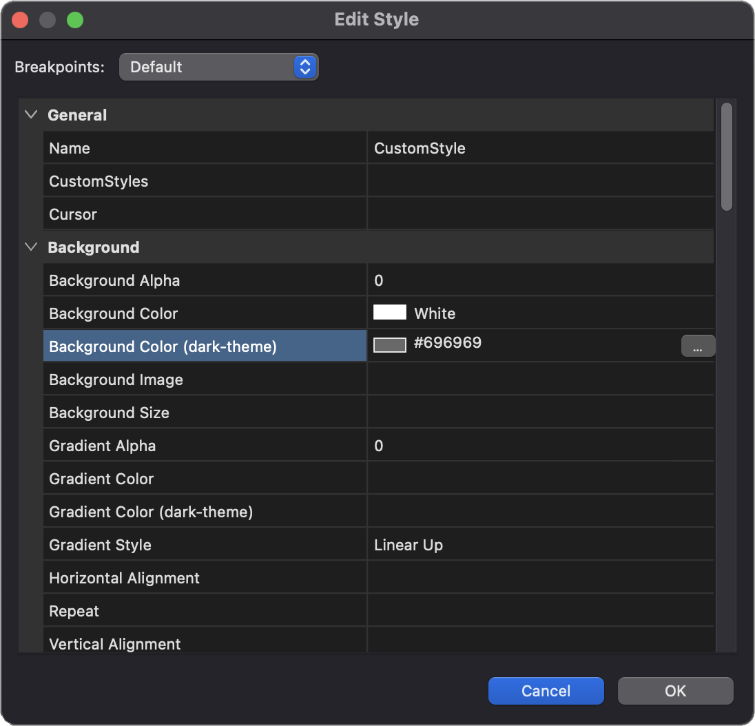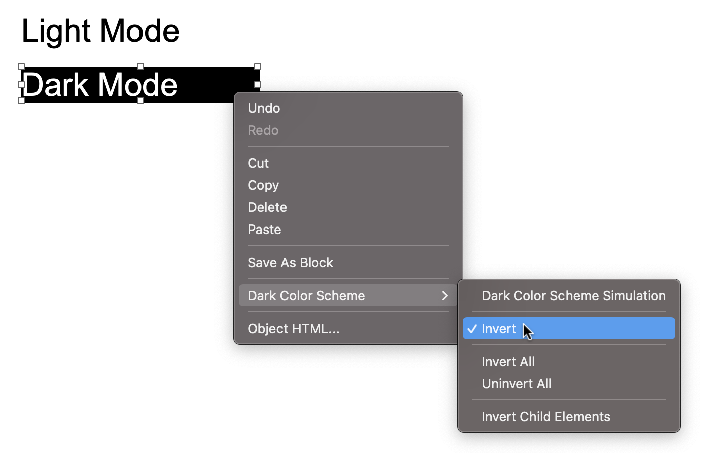 Besides dark mode styles, QWB also has the possibility to invert the colors of an object for the dark color scheme. In that case, you do not have to use styles, but all colors will be inverted (negative) automatically. This property can be set for each object individually.