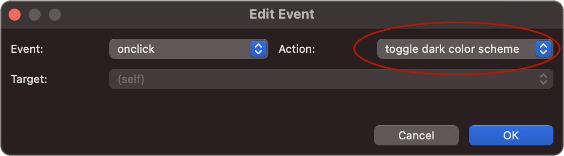 For manual mode, there is a dedicated event action to toggle the color scheme. This can be used with any object that support events.