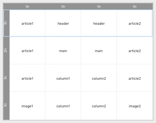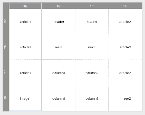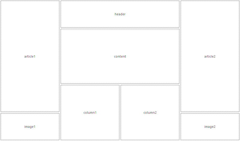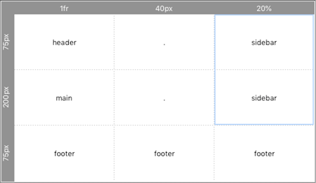 For example: header, footer, sidebar, content, navigation. Only contiguous grid cells can have the same name. So there cannot be two sidebars (left / right) with the same name. A grid item can also be empty. To create an empty grid item use a dot as name.