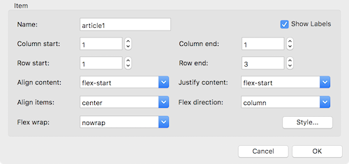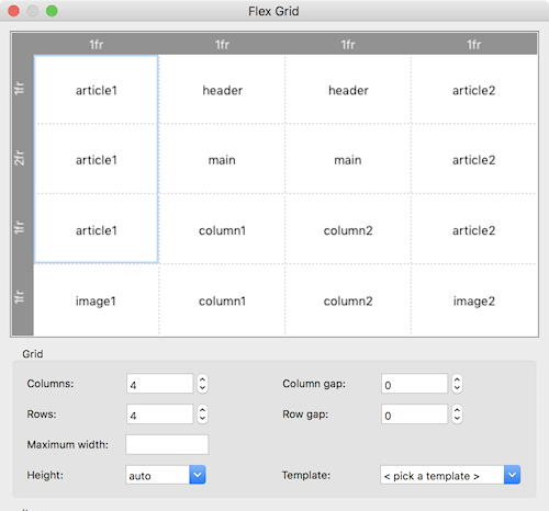 The Flex Grid object has a grid editor so you can visually define the layout (grid areas) and behavior of the grid.