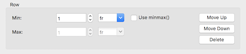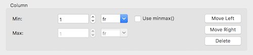 Sizes can be set in pixels, percentages or the ‘fr’ unit. The Min value can have a different size unit as the Max size. For example, the minimum value can be in pixels and the maximum value a flex factor (fr).