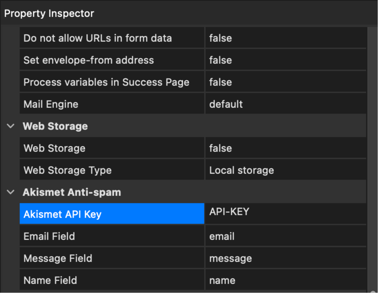 In this section, specify which of your form's input fields should be used for spam filtering with Akismet.