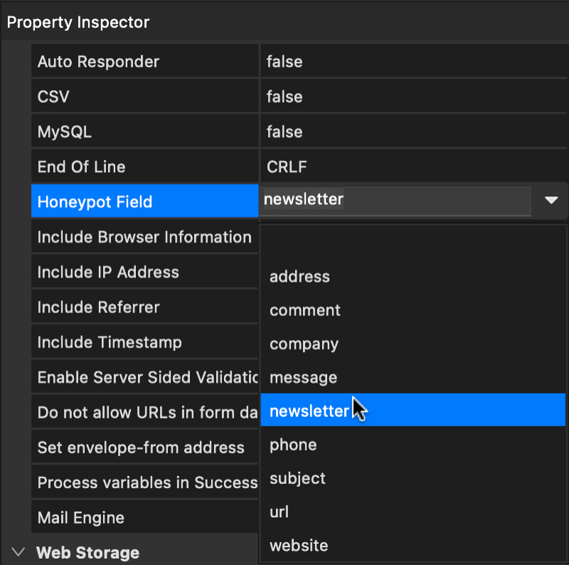The anti-spam honeypot is a hidden form field that bots can’t avoid filling, but it’s invisible to human users. If the hidden field is filled in, it’s a sign of spambot activity and can be blocked. If the field is not filled in, it indicates that the form was filled by a human user as intended. The name of the Honeypot Anti-Spam field name can be set in Form Properties -> Form Processor Advanced.