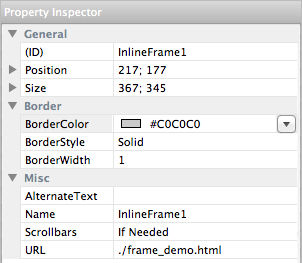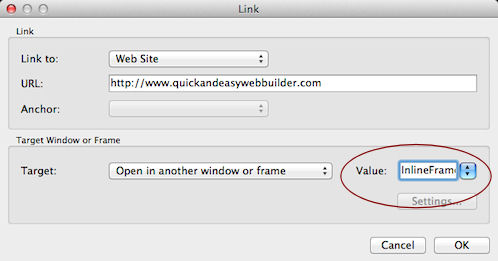 In the example above we have set the name to InlineFrame1, then we opened the properties of a link and set the Target field to InlineFrame1.