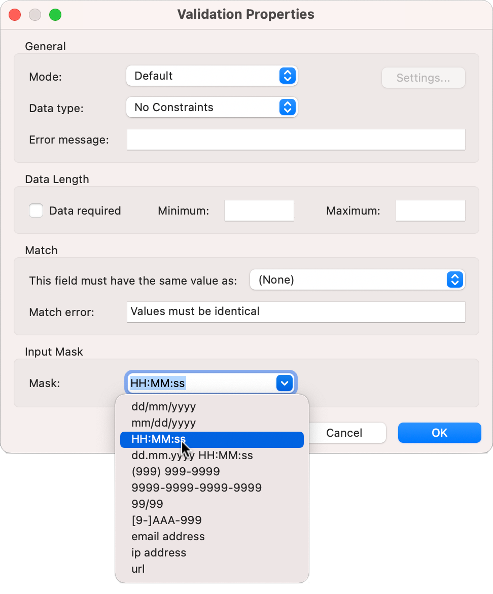 An input mask helps the user with the input by ensuring a predefined format. This can be useful for dates, numerics, phone numbers etc. Input mask functionality is available for the editbox and text area in the 'Validate' properties.