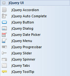 You will find the following jQuery UI Widgets in the Toolbox and Insert Menu: • jQuery Accordion • jQuery AutoComplete • jQuery Button • jQuery DatePicker • jQuery Dialog • jQuery Menu • jQuery Progressbar • jQuery Slider • jQuery Spinner • jQuery Tabs • jQuery Tooltip