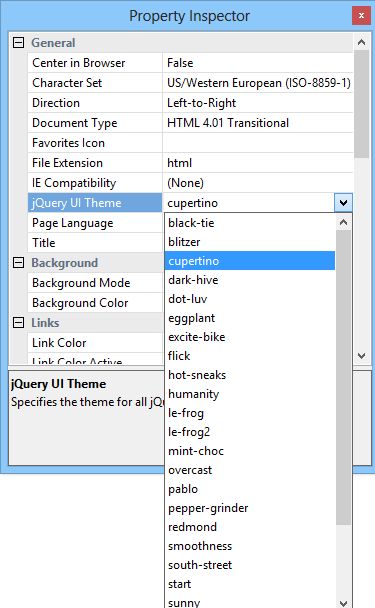 jQuery UI Theme jQuery UI Widgets make use of themes to determine their appearance. All widgets on a page use the same theme. This theme can be selected in the Page Properties.