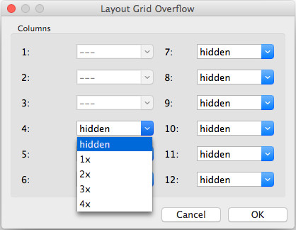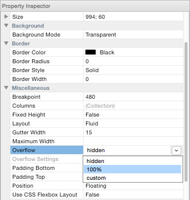 When you have a different number of columns in breakpoints then some breakpoints will can have more columns that another. So you will need to tell the application what to do with the columns that do not fit in a single row. The overflow option controls what will happen when columns do not fit in the current row. Overflow columns can be hidden, 100% or have custom value.