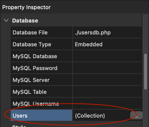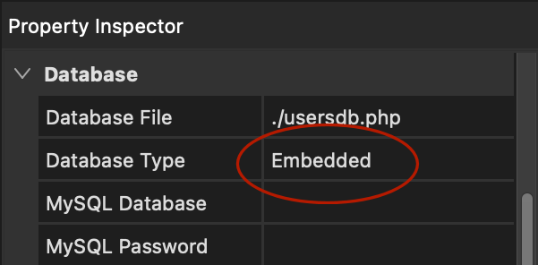 The 'Embedded' database type can be selected in the properties of the Login object.