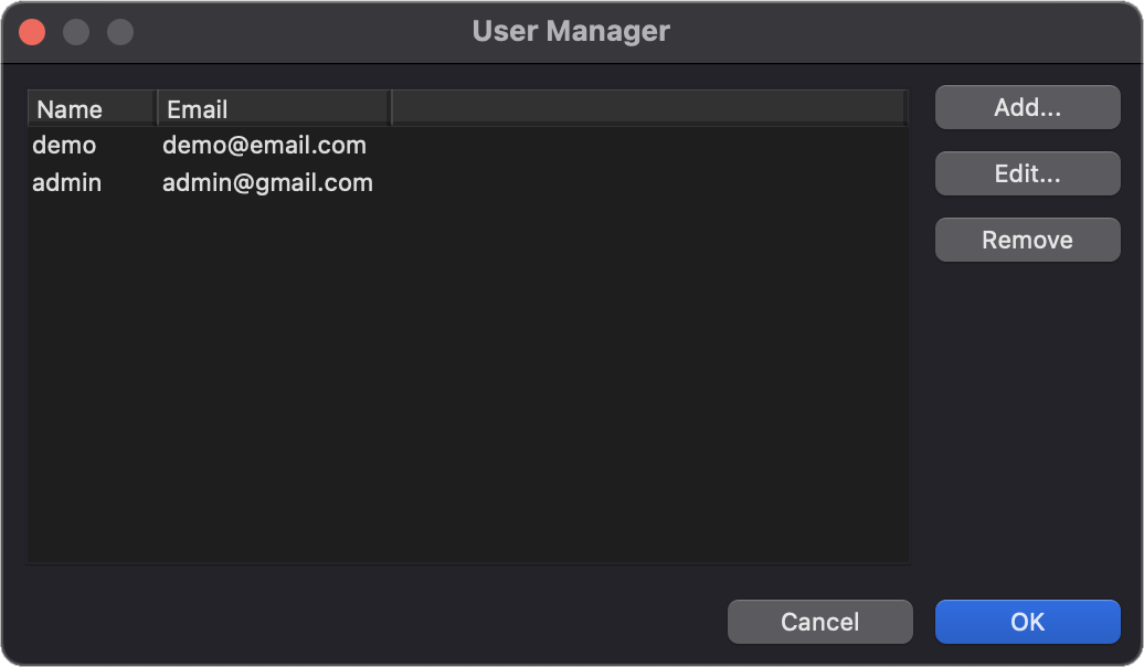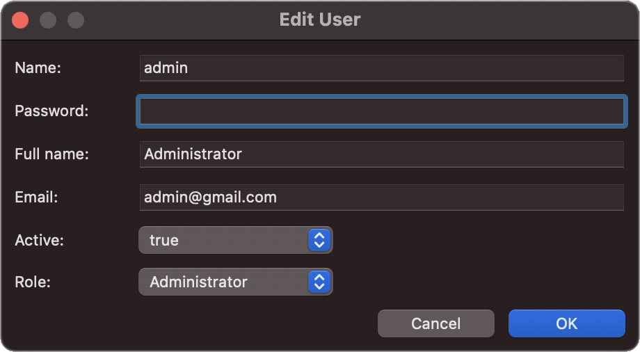 For each user, you can set the name, full name, password, email address, active state and (optional) user role.