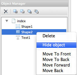 Open the Object Manager (Menu->View->Object Manager). In the Object Manager you will see a list of all objects in the current page. Find the Shape object 'Shape2' and right click the name to display the context menu. Select 'Hide object' and the object will now no longer be visible in the work space.