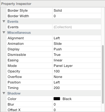 The Display property specifies the relationship of the panel to the page contents. "Push" pushes the page over and "overlay" display the layer over the content. The Dismissible property specifies whether the panel can be closed by clicking outside onto the page.