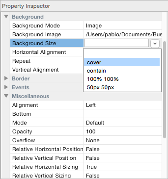 - in the Style properties set the background mode to Image, choose an image and select to 'Do not repeat'