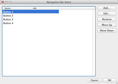 You can add, edit or remove buttons at any time using the properties. Select Add to insert a new button or Edit to modify the properties of an existing button. To remove a button from the Navigation Bar select Remove. You can rearrange the button order by using Move Up and Move Down.