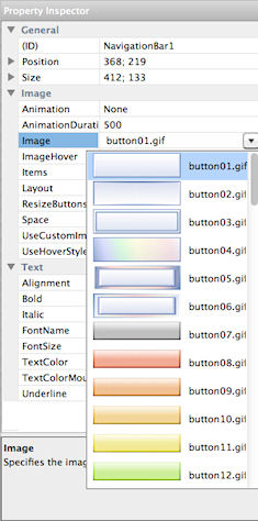 In this window you set things like font type, style, size and color. To change the look of the button select one of the button image from the dropdown list. You can select a different image for when the mouse hovers over a navigationbar button. To select your own images, please select the first item in the list (Use Custom Image), then you will be able to specify the location of an image on your computer.
