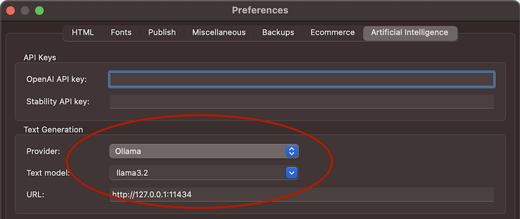 In Quick 'n Easy Web Builder, navigate to Preferences -> Artificial Intelligence, and select Ollama as the provider for text generation.